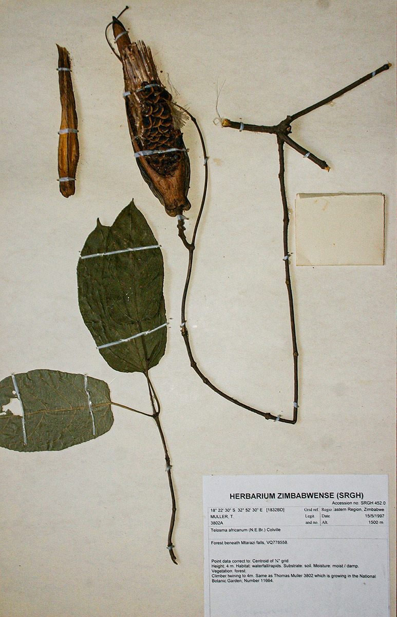 | Notes: | Climber twining up to 4 m. Same as Muller 3802 which is growing at the Harare Botanic Garden (Nr 11664). |