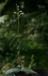 Terrestrial herb, 20 - 35 cm. Leaves 2, basal, appressed to the ground, broadly ovate to almost round, silvery green with darker reticulate veining. Several small bract-like leaves along the flowering stem. Inflorescence laxly 3-12-flowered. Flowers pale green or whitish. Dorsal sepal erect, convex, forming a hood; lateral sepals strongly reflexed. Petals 2-lobed; upper lobes erect, short, ovate, adnate to the dorsal sepal; lower lobes filiform 2-3 cm, deflexed or spreading. Lip 3-lobed c. 2 mm from the base; mid-lobe linear, c. 8 mm; side lobes filiform, 2-3 cm, similar to anterior petal lobes. Spur 2-3.5 cm, somewhat incurved, slightly swollen at the apex. |