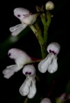 Slender terrestrial, less than 40cm. Leaves along the stem, linear lanceolate. Largest leaves near the base, up to 15 cm, folded along the length. Inflorescence lax, many-flowered. Flowers white to pale pink with darker markings. The flowers contrasting with the deep reddish purple ovaries, pedicels and bracts. |