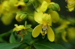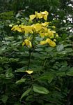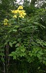 Shrub or small tree. Leaves paripinnate without any glands on the rhachis or petiole; leaflets in 4-9 pairs, hairless, ovate-elliptic, tapering. Flowers in showy, erect pyramidal panicles, bright yellow. Fruit a brittle, blackish-brown pod, up to 60 cm long, tapering at both ends. |