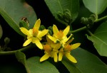 Usually a shrub, sometimes a small tree. Bark smooth, pale grey; young branches with soft woolly stellate hairs. Leaves alternate, oblong-obovate, 5-18 cm cm long, 3-veined from an asymmetric base, often abrubtly pointed at the apex, green and nearly hairless above, paler and finely greyish hairy between the veins beneath; margin toothed: petiole up to 1 cm long, with small tufts of stellate hairs. Flowers in 2-3-flowered axillary clusters, c. 3 cm in diameter, bright yellow, showy in profusion. Flower stalks and back of the sepals with distinct small scattered tufts of short rusty hairs. Fruit almost completely divided into 2 separate spherical lobes, each part up to 1.3 cm in diameter, yellow when ripe. |