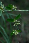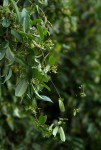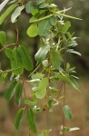 Many-stemmed climber with milky sap and twining stems 3-5 m long, often purple-brown. Leaves opposite, oblong-elliptic, oblong-obovate, 3-9 cm long, green above; much paler blue-green beneath; apex obtuse to emarginate with a distinct mucro; petioles 4–10 mm long, often purple-brown. Inflorescences axillary, lax to sub-compact, few to many-flowered, hairless. Sepals broadly ovate, 1.5–2 mm long. Corolla creamy-yellow; tube campanulate, 1.5–2 mm long, with papillose spots; lobes linear to linear-ovate, 6–8 mm long. Corona double; lower whorl of clavate lobes, c. 1 mm long; upper whorl of sinus pockets. Fruit consisting of a pair of narrowly linear-lanceolate follicles, horizontally spreading, pointed at the apex, horisontally opposite, cylindrical-ovoid, 8–15 cm long. |
