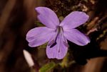 Small herbaceous shrub, up to 1.3 m tall, sometimes scrambling. Stems covered in short and coarse yellowish hairs. Leaves opposite, ovate or elliptic, 4-10 cm long, densely covered in pale grey stellate hairs when young, becoming more or less hairless when older. Flowers in 2-7-flowered axillary clusters. Bracteoles linear-lanceolate, in unequal pairs, largest 10-23 mm long; margin with widely spaced teeth and a spiny apex. Calyx lobes broadly ovate, largest 13-19 mm long, translucent with conspicuous reddish-brown veining; margin with coarse spiny teeth. Corolla 27-37 mm long, blue-mauve with a white tube, hairy on the outside. Capsule 11-13.5 mm long, mostly hairless. |