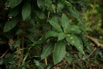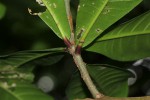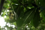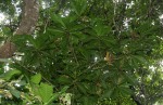 Evergreen shrub or tree. Leaves crowded at the ends of branches, obovate-oblong to obovate-oblanceolate, 14-40 cm long, dark green above, paler beneath, midrib prominent beneath often purplish near the petiole; margin finely and shallowly toothed; petiole short, up to c. 1 cm long, often purplish. Inflorescences in long pendulous racemes up to 70 cm long. Flowers 4 petals with small sepals and petals 15-25 mm long, white often flushed with pink; stamens numerous, forming a central mass up to 3.5 cm in diameter, white or pinkish; flowers open at night and have an unpleasant scent. Fruit conical to ovoid, 3-7 cm long, crowned by the persistent calyx and style, fleshy when young but becoming hard, fibrous and coppery reddish-green. |