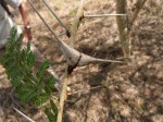 A small tree to 9 m tall. The bark is smooth, consisting of a thin whitish or reddish-brown powdery covering, which rubs off to expose green succulent under bark. Typically branches in the lower 1 m or more are burned off, while the trunk remains unscarred. The paired spines are straight, white, and in var. fistula often fused and swollen at the base forming ant-galls. The flowers are in bright yellow globose heads. Pods linear-falcate, 7-22 cm long, more or less constricted between the seeds, hairless but with some sessile glands. |